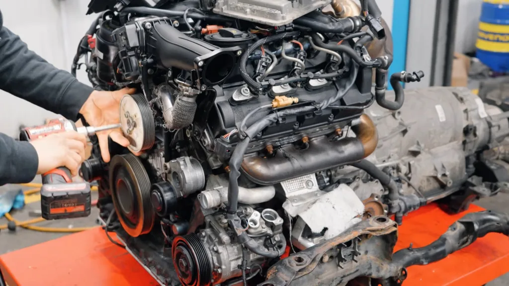 Bilen är en Audi A8 med 3.0 TDI-diesel. När arbetet inleds blir det snabbt tydligt att problemen inte är nya. Det finns spår av läckage som pekar på att något har pågått under lång tid utan att det märkts i vardagskörningen.
