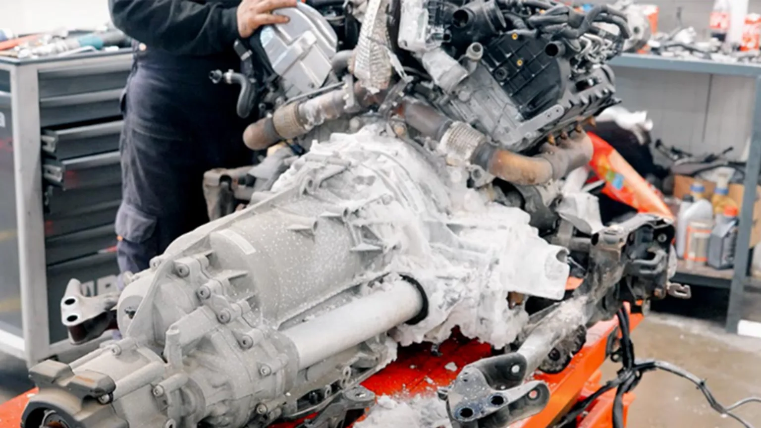Motorn lyfts ur bilen för att komma åt ordentligt. Arbetet som först såg ut som en vanlig service växer snabbt. Del efter del plockas bort och rengörs. Ventilkåpor, insug, avgassystem och kamkedja demonteras. På flera ställen syns rester som inte ska finnas där men som ändå inte orsakat ett omedelbart stopp.
