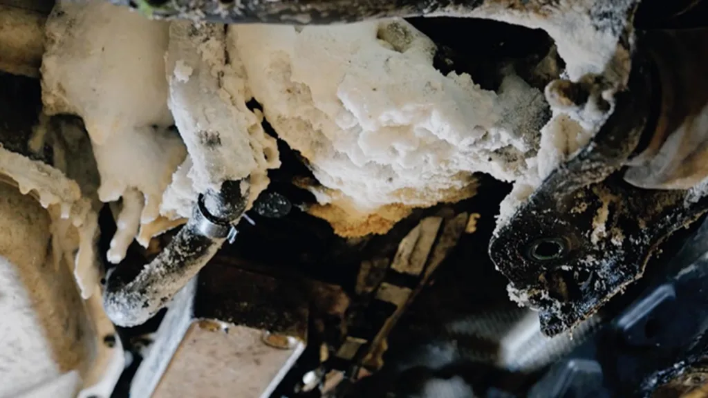 På flera platser runt motorn finns hårda, vita avlagringar. Det som läckt har inte runnit bort, det har stelnat. Boven visade sig vara AdBlue, något som även svenska verkstäder nyligen varnat för inte klarar av kallare klimat.