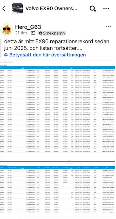 En annan svensk ägare som vi skrivit om fick sin EX90 obrukbar redan efter 90 mil när elbilen plötsligt inte längre gick att ladda. Den fick bärgas till verkstad, där den blev stående i veckor i väntan på delar. Även där var beskeden osäkra och reparationen drog ut på tiden utan tydlig lösning.