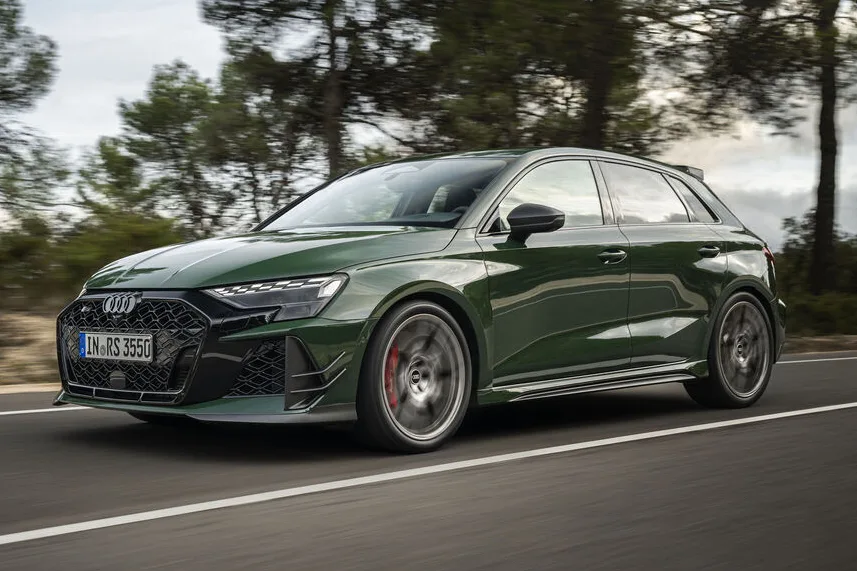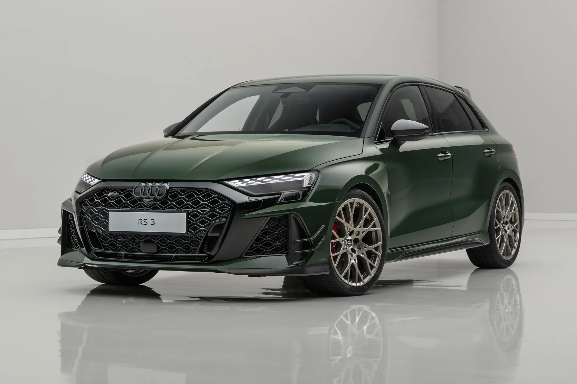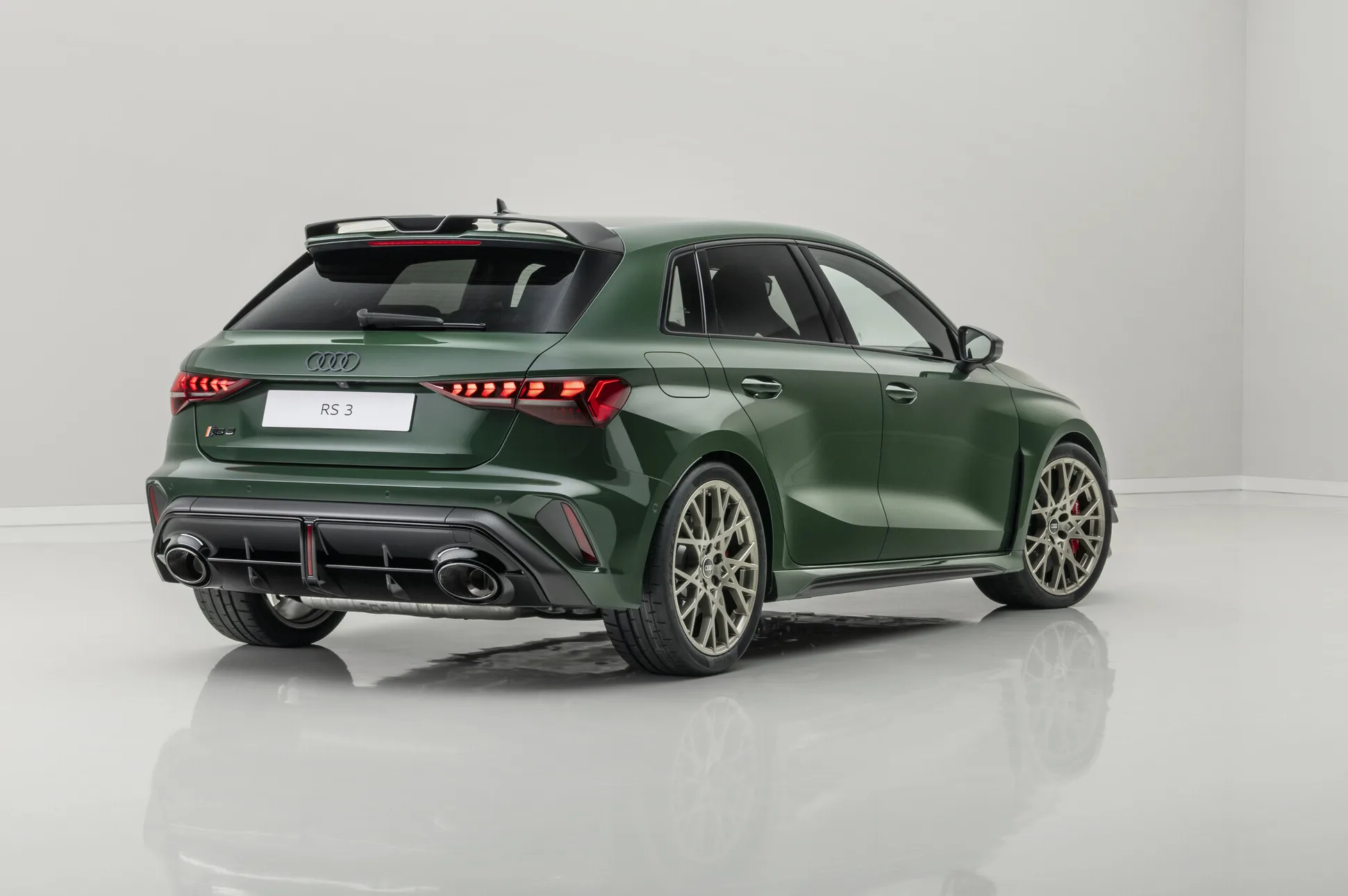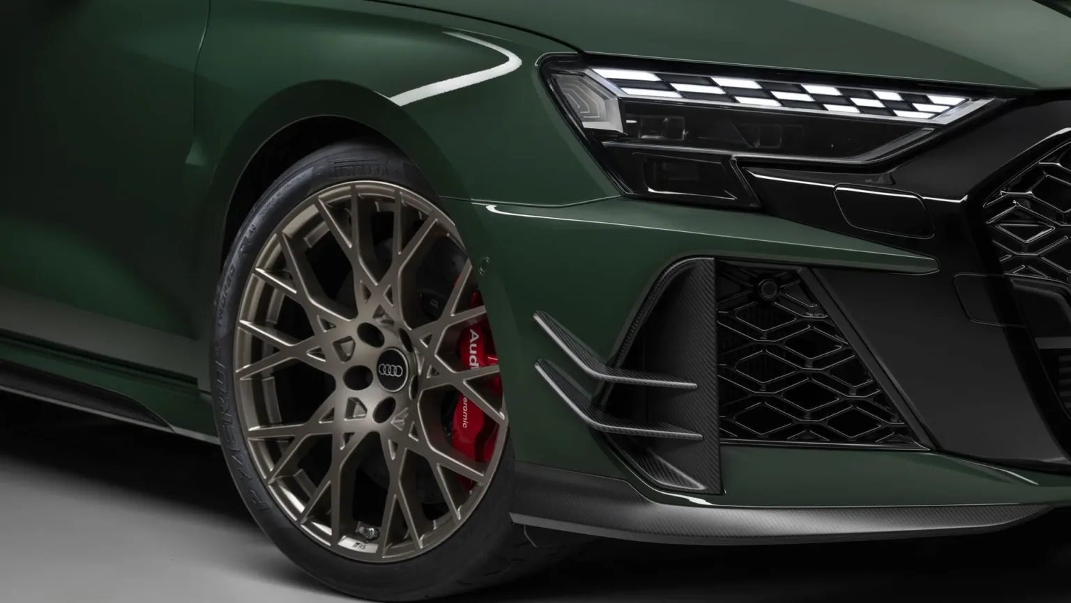 Audi RS3 Competition Limited har gjorts ännu aggressivare med en delad frontläpp och dubbla ”canards” på varje sida – små vingar i matt kolfiber som ökar marktrycket. Audi lanserar den exklusiva färgen Malakitgrön. Det är en direkt blinkning till den ikoniska Audi Sport Quattro som dominerade rally-VM under 80-talet. För att bryta av mot det gröna står bilen på 19-tums fälgar lackerade i matt Neodymium-guld.