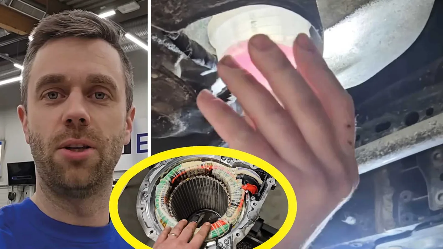 I sitt klipp visar Jesse steg för steg hur motorn i elbilen läcker kylvätska redan från fabrik. Vätskan samlas i en liten burk under motorn. Det är en lösning som enligt honom inte räcker till.