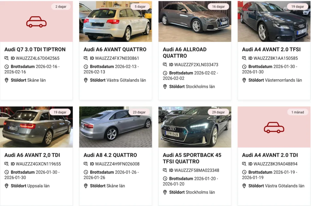 Ett axplock av just nu rapporterade stulna Audis hos Larmtjänst.