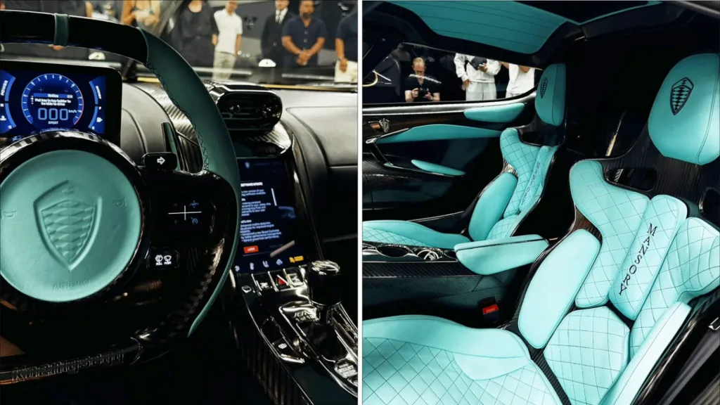 Kolfiberstolarna är klädda i turkos läder. Samma läder finns på dörrpaneler, ratt, mittkonsol och tak, alla med svart quiltad söm.