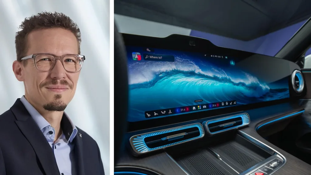Mercedes-Benz erkänner sina misstag – tar tillbaka fysiska knappar. På bild: Försäljningschef Mathias Geisen och pekskärm från Mercedes-Benz.