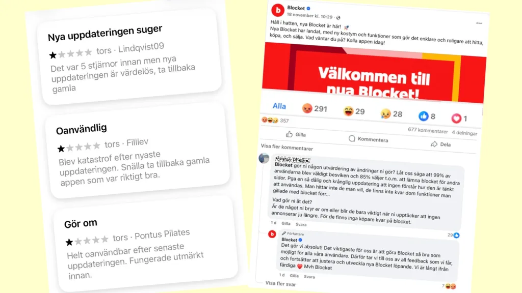 Även i App Store är recensionerna hårda. Användare beskriver att den tidigare lättanvända appen blivit ”totalt oduglig”, att filterlistorna blivit oöverskådliga och att det nya gränssnittet känns förvirrande. På Blockets Facebook-sida är tonen lika frustrerad, även om det åtminstone finns möjlighet att få svar direkt från Blocket.