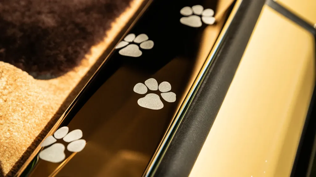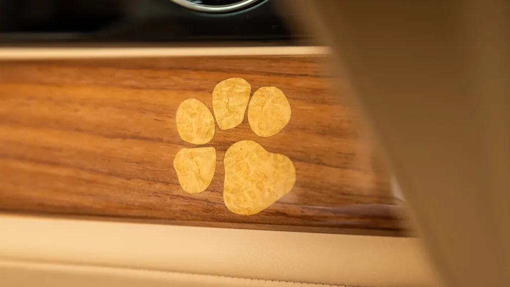Karossen är speciallackerad i en kulör som ska likna hundens päls, komplett med tassavtryck i roséguld. Men det är insidan som verkligen skiljer ut sig. Det börjar redan på trösklarna som bär Baileys tassavtryck i roséguld. Mellan baksätet finns ett porträtt av Bailey, utfört i 180 fanerbitar av valnötsträ.