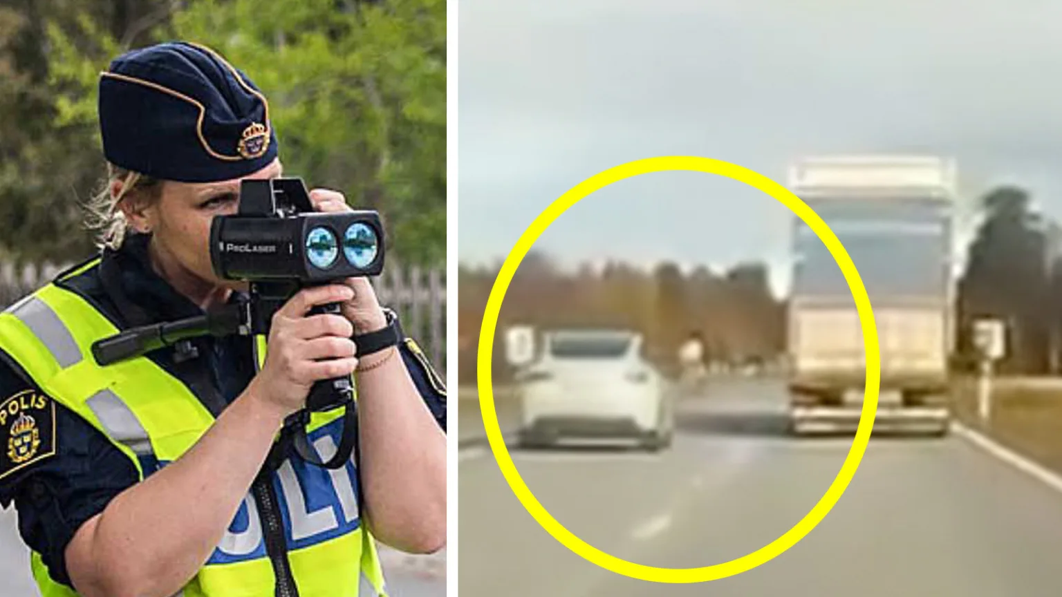Tesla-förarens gick i fällan: Kör om i hög hastighet precis när filerna går ihop. Men han missade att en polispatrull väntade med lasern längre fram. Händelsen delar bilister i två läger.