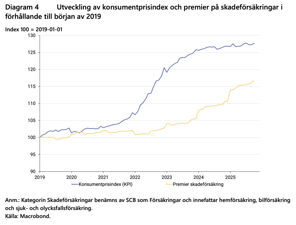 Från början av 2019 till oktober 2025 har premierna för skadeförsäkring ökat med knappt 17 procent. Under samma tidsperiod har konsumentprisindexet (KPI) ökat med närmare 28 procent. Sett över en