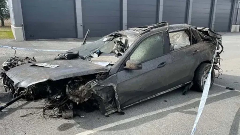 Bilen efter kraschen. Motorn hittades cirka 100 meter från bilen. Foto: Polisen