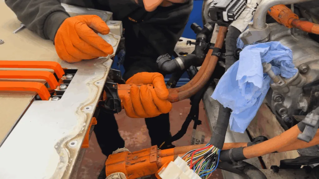 För att komma vidare tvingades verkstaden plocka isär nästan hela bilen. Framvagn, elmotor, växelriktare, den inbyggda laddaren, kylsystemet och till sist hela högvoltsbatteriet med 36 moduler.