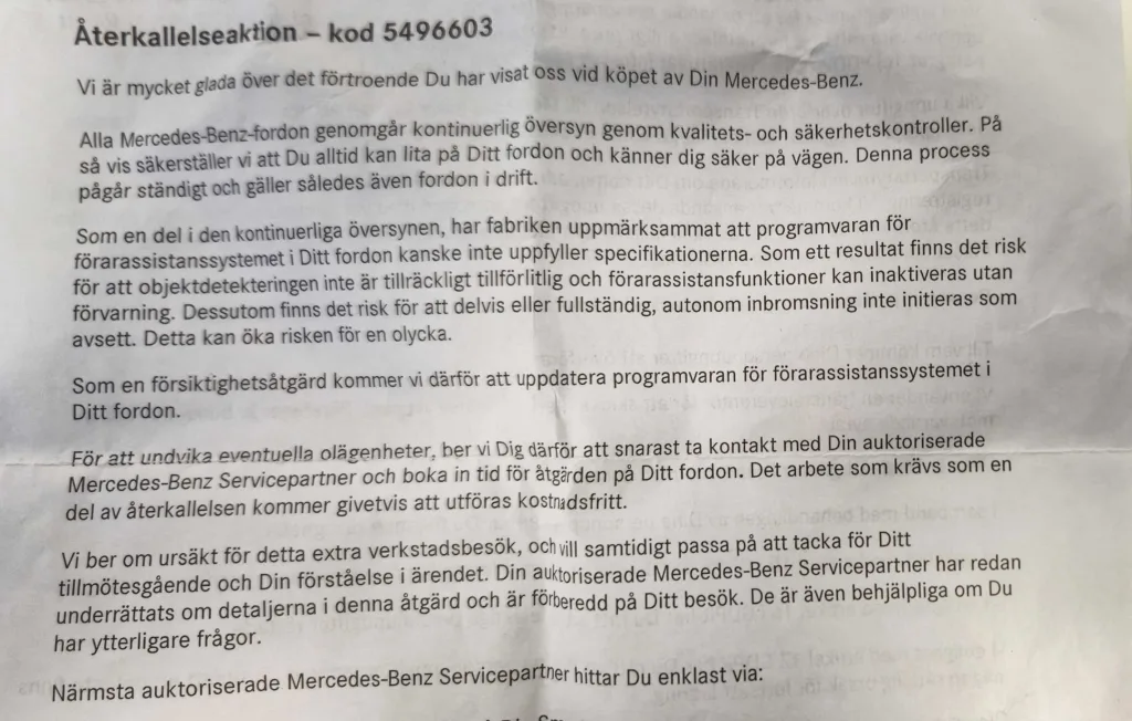 – Som en del i den kontinuerliga översynen, har fabriken uppmärksammat att programvaran för förarassistanssystemet i Ditt fordon kanske inte uppfyller specifikationerna. Som ett resultat finns det risk för att objektdetekteringen inte är tillräckligt tillförlitlig och förarassistansfunktioner kan inaktiveras utan förvarning. Dessutom finns det risk för att delvis eller fullständig, autonom inbromsning inte initieras som avsett. Detta kan öka risken för en olycka. Som en försiktighetsåtgärd kommer vi därför att uppdatera programvaran för förarassistanssystemet i Ditt fordon, skriver Mercedes i återkallelsen.
