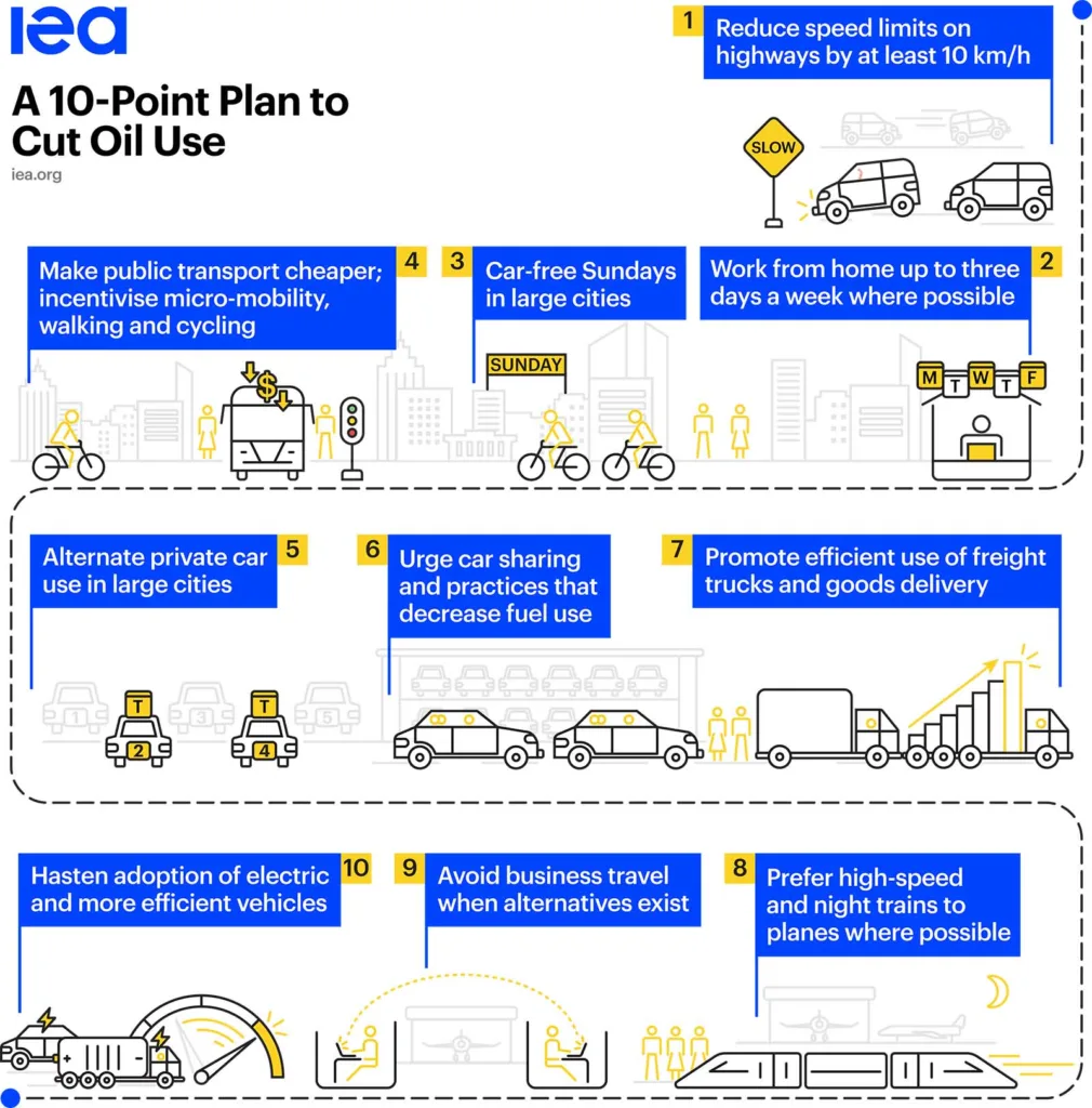 I brevet hänvisar den danska energikommissionären till den tiopunktsplan som nyligen släpptes av Internationella energiorganet (IEA). Där föreslås bland annat att människor bör uppmanas att arbeta hemifrån mer och använda kollektivtrafik oftare.