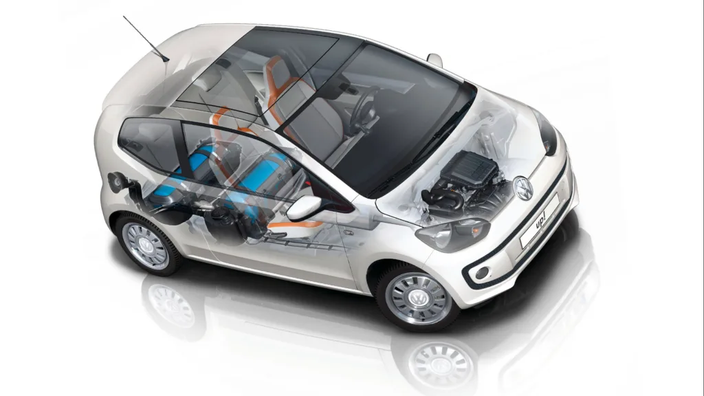 Volkswagen Eco Up! 2013. Gasen lagras i två tankar under golvet, placerade nära bakaxeln. Den lilla bensintanken sitter intill och är främst tänkt som reserv för start och kortare körning.
