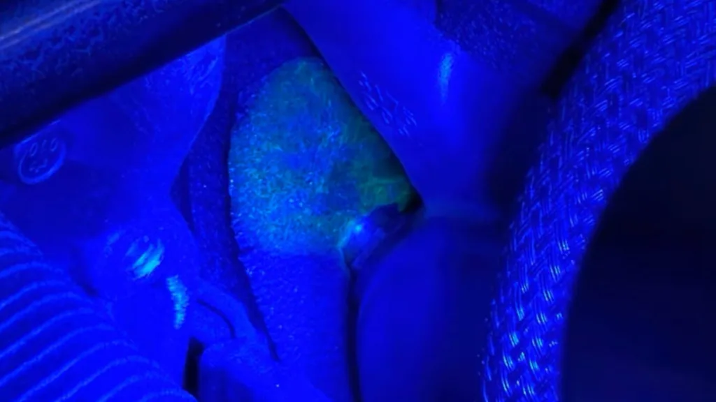 För att tydligt se läckan använder verkstäder UV-lampa, eftersom spårmedlet lyser upp när det finns i systemet.