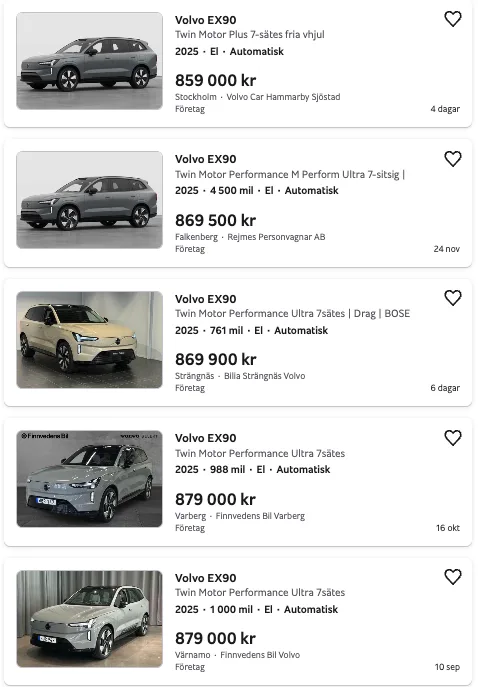 Samtidigt pressas priserna från ett annat håll. Fabriksnya EX90 reas just nu ut med rabatter på upp till 200 000 kronor. Det finns bilar som säljs för omkring 919 000 kronor utan att ha rullat en enda mil. Plötsligt konkurrerar begagnade exemplar direkt med fabriksnya bilar och då blir värdefallet kraftigt.