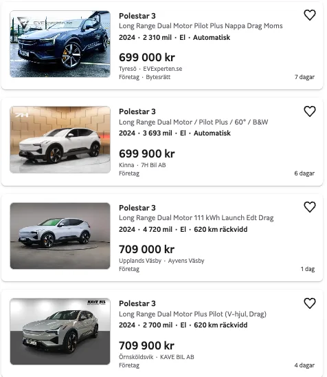 Samma mönster syns hos systermodellen Polestar 3. Där har värdet fallit med omkring 400 000 kronor efter 2 310 mil. Även här är det den snabba teknikutvecklingen som spökar. När nya versioner blir effektivare, laddar snabbare och erbjuder mer prestanda tappar de tidiga exemplaren snabbt i attraktivitet.