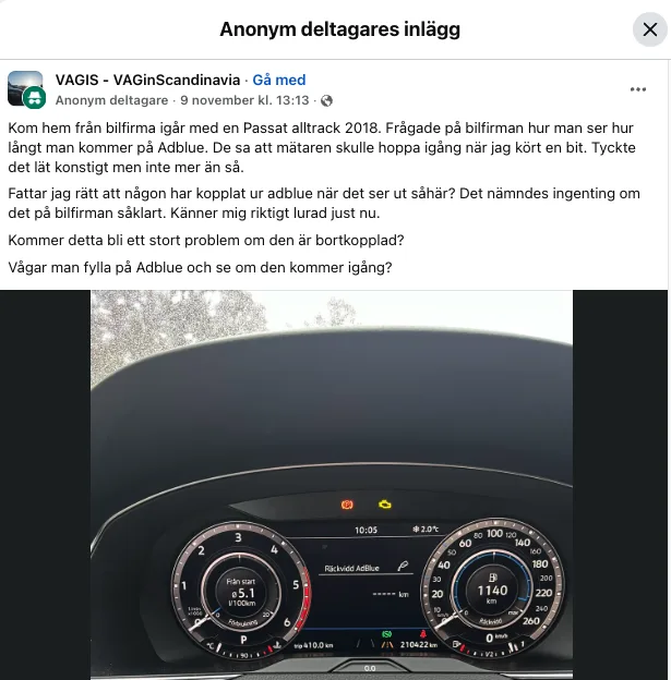 – Kom hem från bilfirma igår med en Passat Alltrack 2018. Frågade på bilfirman hur man ser hur långt man kommer på AdBlue. De sa att mätaren skulle hoppa igång när jag kört en bit, skriver personen.