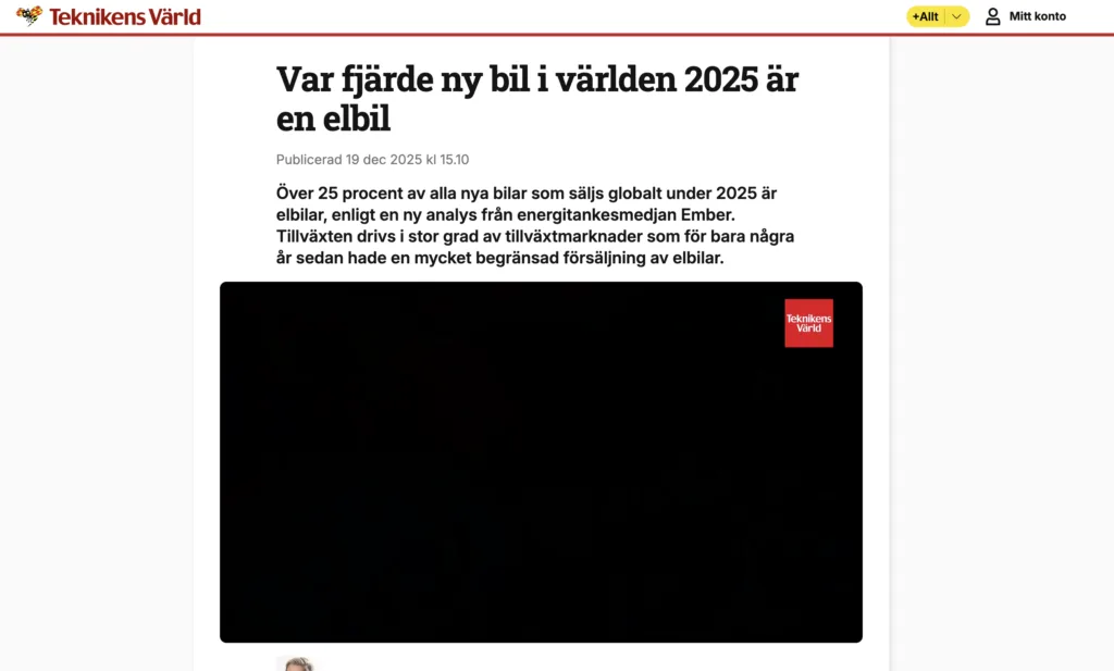 Elbilarnas andel har ökat i år, men knappast till 25 procent. Helt säkerställd statistik för 2025 saknas ännu, men enligt EVWire som säger sig ha sammanställt 98 procent av alla elbilar som sålts (65 marknader) skulle det under första halvåret i år ha sålts 5,9 miljoner batterielektriska elbilar (BEV). Autovista (JD Power) anger 6 miljoner elbilar Enligt ACEA har det sålts 37,4 miljoner bilar i världen under första halvåret. Det skulle kunna innebära att elbilarna första halvåret i år har en försäljningsandel på 15,8-16 procent. EVWire anger 15,4 procent. Det är den senaste kända uppgiften i frågan. Det är knappt var sjätte ny bil som sålts.