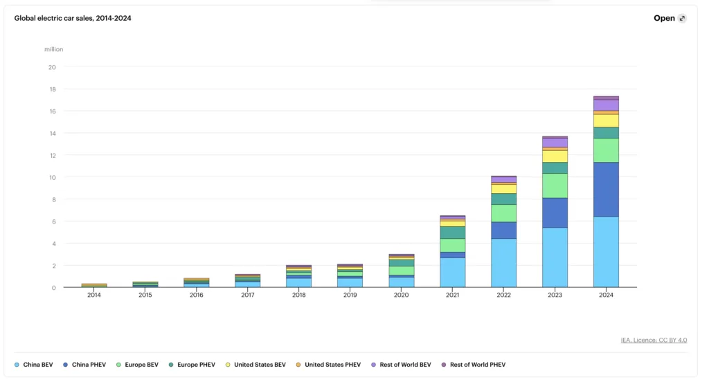Att hitta korrekta helt tillförlitliga siffror på hur många elbilar som verkligen säljs i världen är inte enkelt. Men enligt detaljuppgifterna i grafiken hos IEA(International Energy Agency) såldes förra året 10,8 miljoner riktiga elbilar i världen. Enligt ACEA såldes det 74,6 miljoner nya bilar i världen under 2024. Det skulle tyda på en elbilsandel på 14,4 procent.