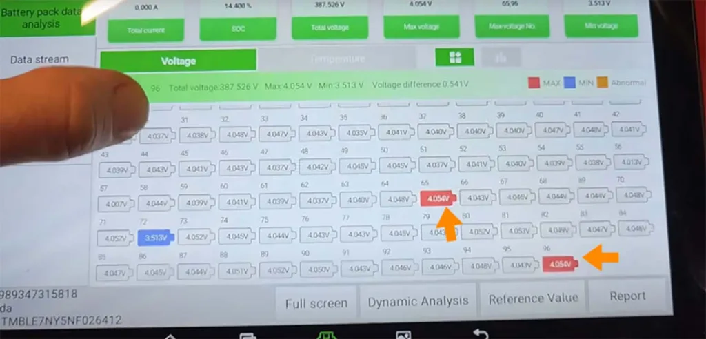 Av elbilens 96 battericeller är det nummer 72 som har en lägre spänning än resten. Men eftersom cellerna är seriekopplade påverkas hela batteriet och därför minskar räckvidden. På grund av den sämre cellen tillåter inte batteriets BMS-system att de andra cellerna laddas fullt heller, vilket gör att Skodan bara har en räckvidd på 5 mil.