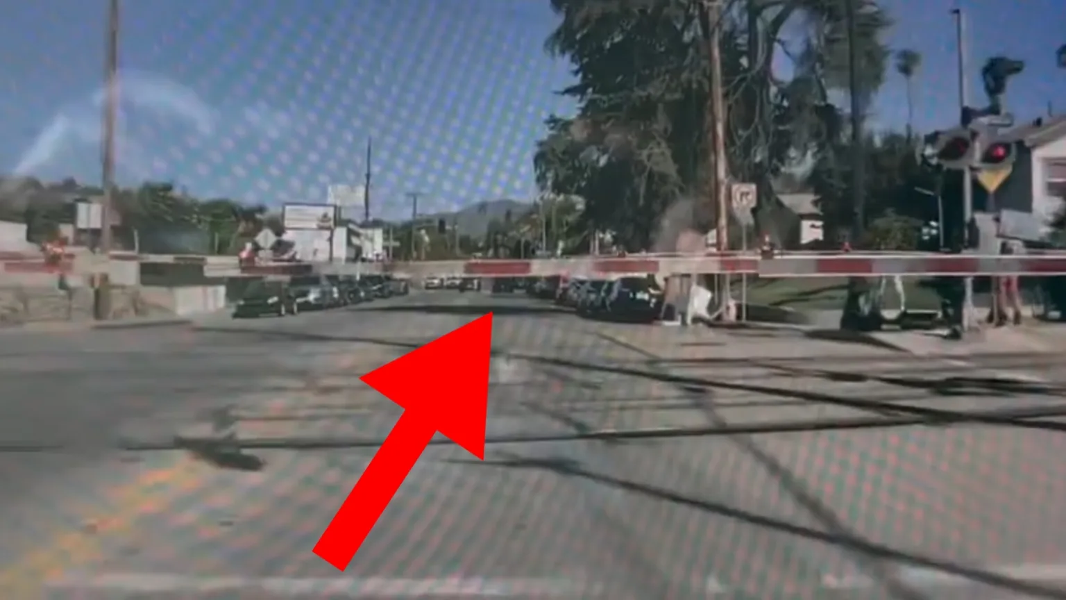 Chockfilmen avslöjar den dramatiska sekvensen. Självkörande Tesla kör rakt genom nedfällda tågbommar.