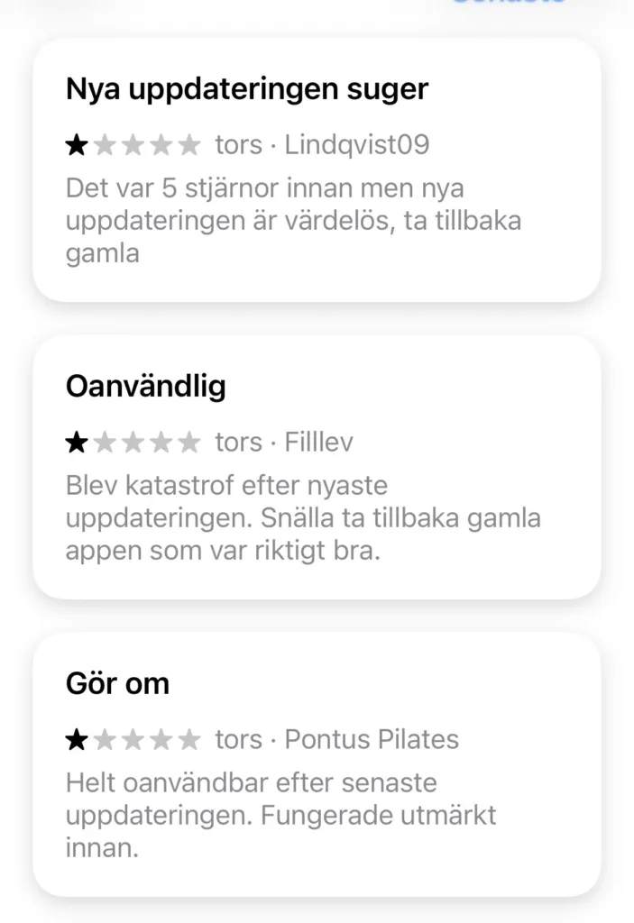 – Senaste uppdateringen var ett misslyckande. Från att ha varit en klockren app som är lätt att använda till en app som är totalt oduglig, skriver en tredje.