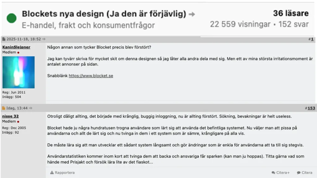 Missnöjet med nya Blocket fortsätter att koka. Det som skulle bli en modernare och enklare tjänst har i stället blivit en av årets största digitala snackisar. Användarna rasar på forum, sociala medier och i omdömen. Kritiken handlar inte längre bara om att designen ändrats, utan om att själva sökupplevelsen upplevs som förstörd. Och redan nu märker företagare av att färre söker efter annonser på Blocket.