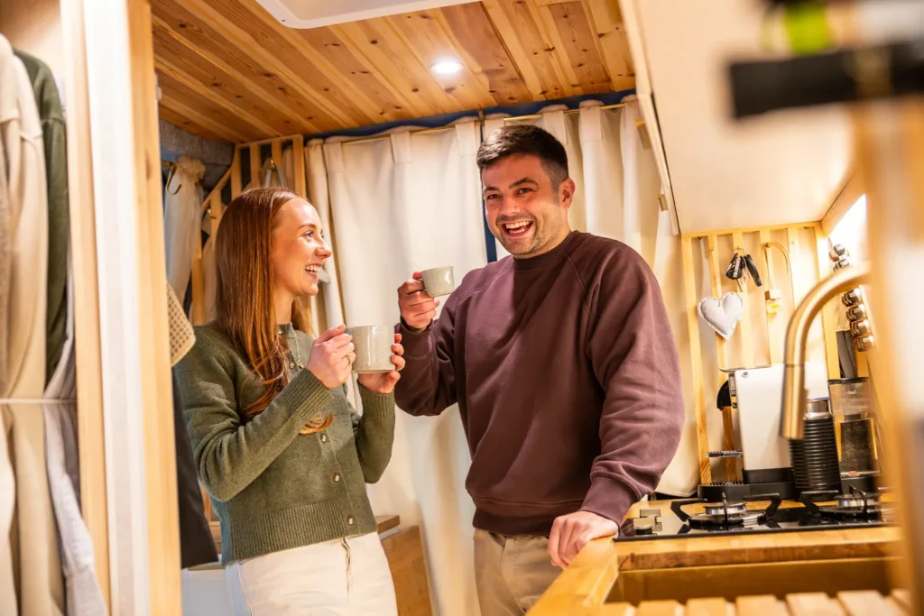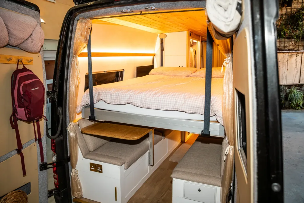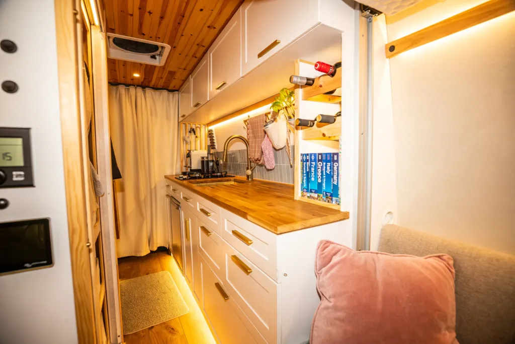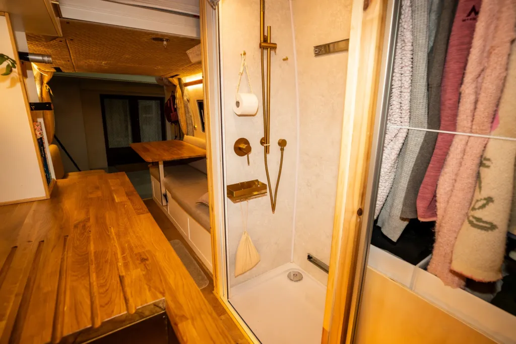 När de visar upp sin husbil blir man helt förstummad. Det är helt otroligt vad de lyckats skapa av det trånga utrymmet. Här finns till exempel ett kök och sittplatser för sex personer. Dessutom finns också ett upplyst vinställ och köket ger möjlighet att laga stora middagar. Dessutom har de lyckats klämma in ett badrum med både toalett och en dusch som slår de flesta husvagnar och husbilar på fingrarna. Här går det verkligen att göra sig ren på kvällen efter en lång dag med utflykter eller skidåkning.
