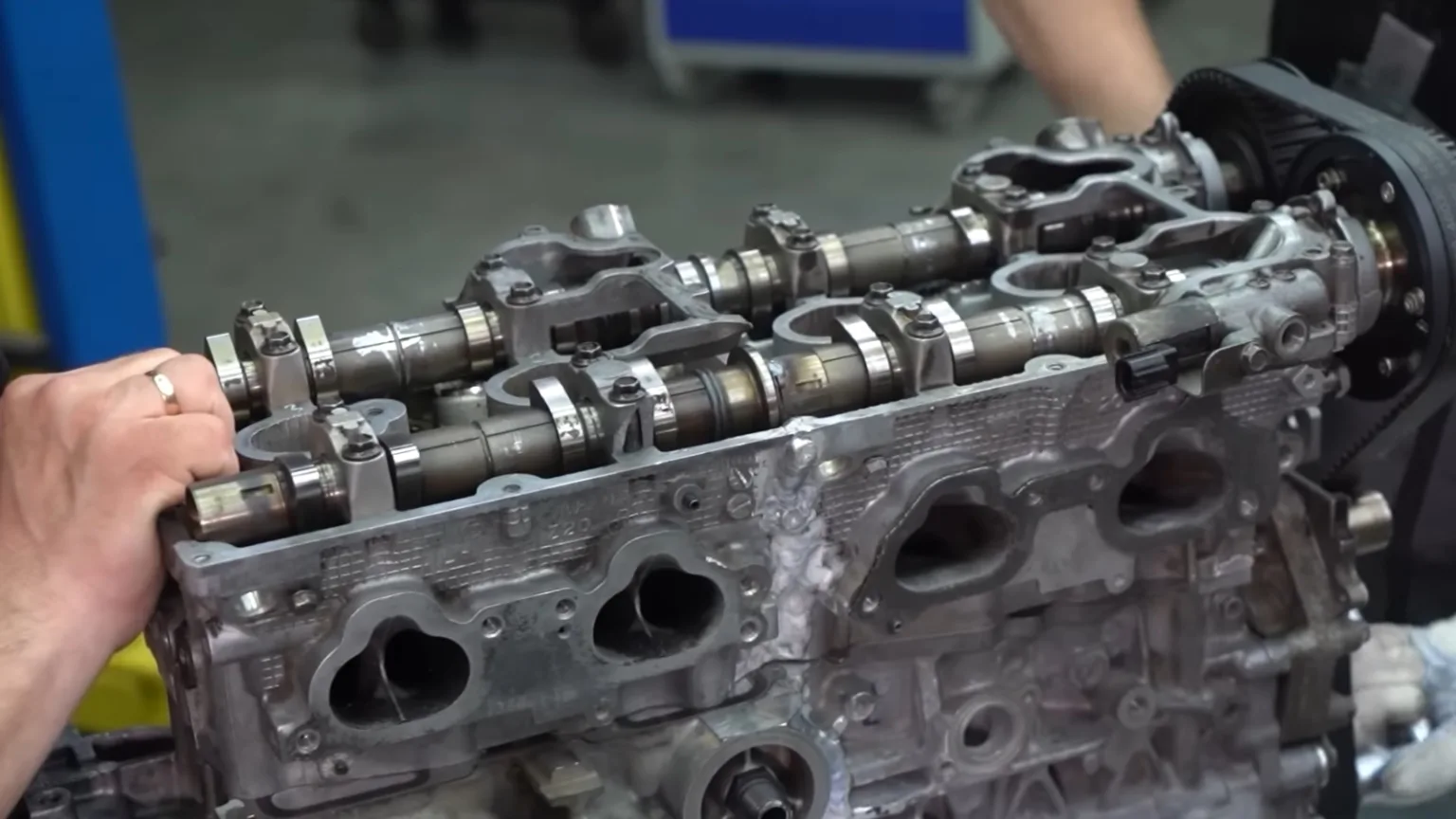 Samma procedur gjordes för de roterande delarna. Kamaxlarna är gjorda av två fabriks-kamaxlar svetsade ända mot ända, och de placerades så att originalinställningen behölls. Vevaxeln byggdes av två fabriks-vevaxlar som kopplades ihop med specialtillverkade flikar. För vissa kan det låta enkelt, men monteringen var knepig.
