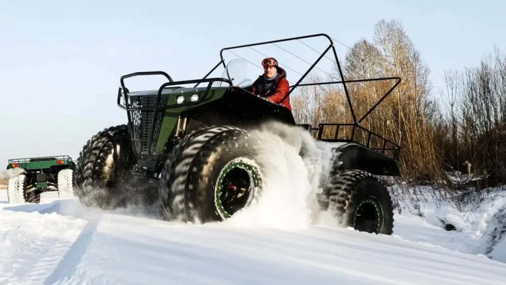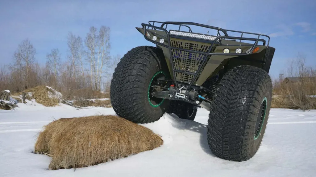Ryssarna säljer flera olika varianter av bjässen på fyra hjul och den största med den bästa utrustningen kallas såklart för “Big Profile”. Den är över fyra meter lång och två och en halv meter bred. Det som däremot ögon främst fastnar för är de enorma 57-tumsdäcken. Allt detta tillsammans får fyrhjulingen att se ut att vara direkt tagen från Mad Max-filmerna.