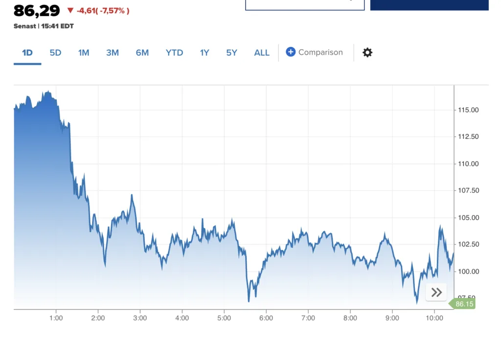 Under måndagens sena handel föll priserna tillbaka kraftigt. Amerikansk råolja (WTI) dök med över 6 procent till cirka 85 dollar fatet. Vändningen kom efter att president Donald Trump i ett telefonsamtal med CBS News meddelat att fartyg nu rör sig genom sundet igen och att han personligen överväger drastiska åtgärder.