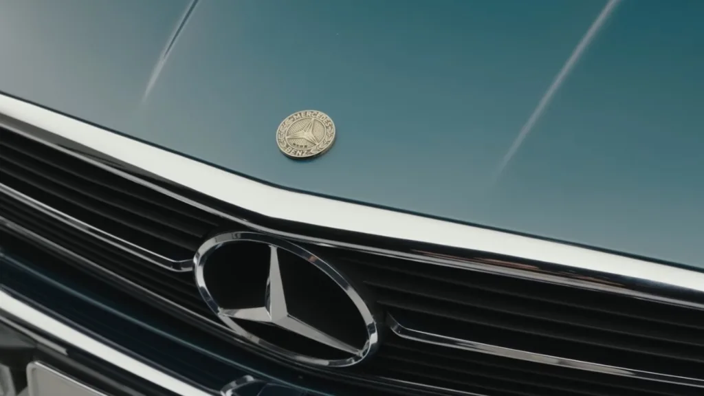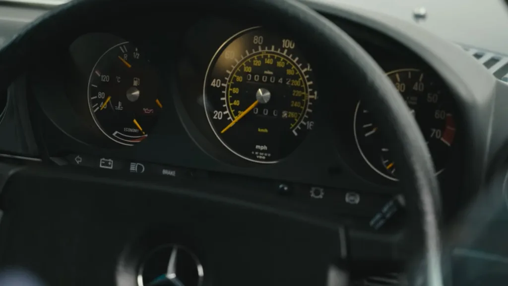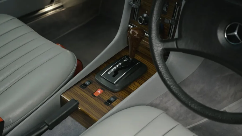 Invändigt ser lädret ut som nytt, med den karaktäristiska doften av färskt skinn. Varje liten detalj visar att denna 500 SL i praktiken har frusit i tiden. Bland alla Mr. Houghs omsorgsfulla detaljer finns en som verkligen sticker ut: Mercedes-emblemet på motorhuven, i äkta sterlingsilver och handgjort av Mr. Hough själv. Det är den enda modifieringen på hela bilen.