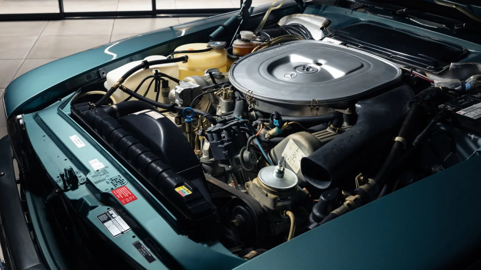 Med endast leveransmiltal har den 5,0-liters naturligt insugna M117 V8-motorn aldrig ens brummat till ordentligt. Motorn levererar 242 hästkrafter och 400 Newtonmeter i vridmoment, och kraften förs till bakhjulen via en fyrväxlad automatlåda. Och det finns ingen rost någonstans. Den blågröna metallic-lacken behåller en djup och rik ton, som skiljer sig från andra bilar i samma färg. Troligen eftersom den aldrig har utsatts för sol eller väder.
