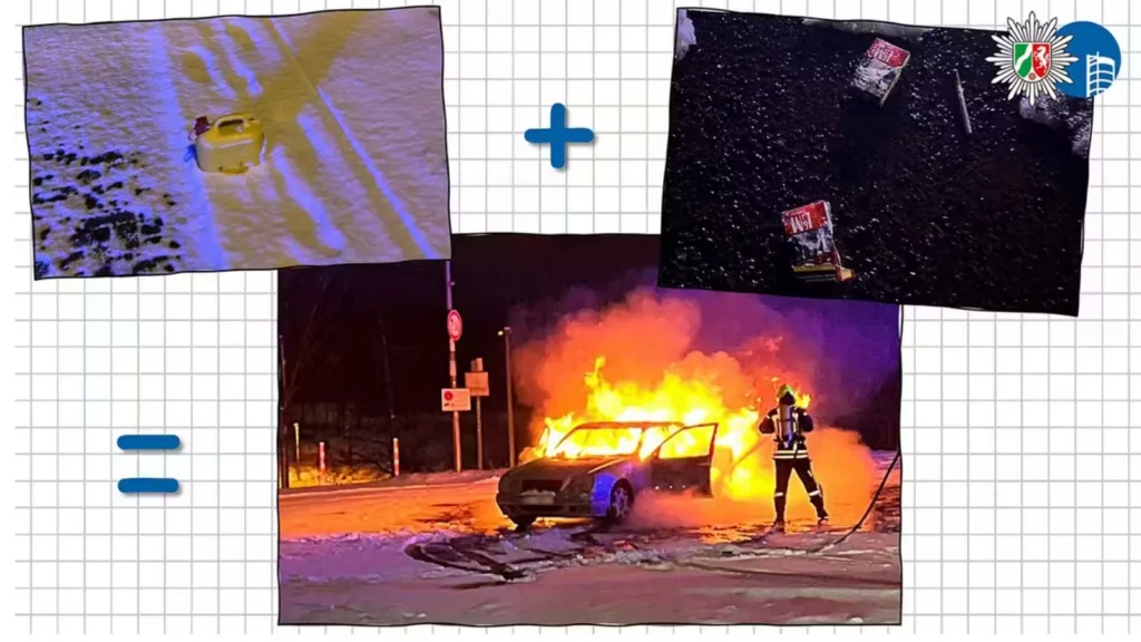 – I närheten av bilen hittades bland annat bensindunken och flera cigarettpaket, skriver tyska polisen på Facebook.