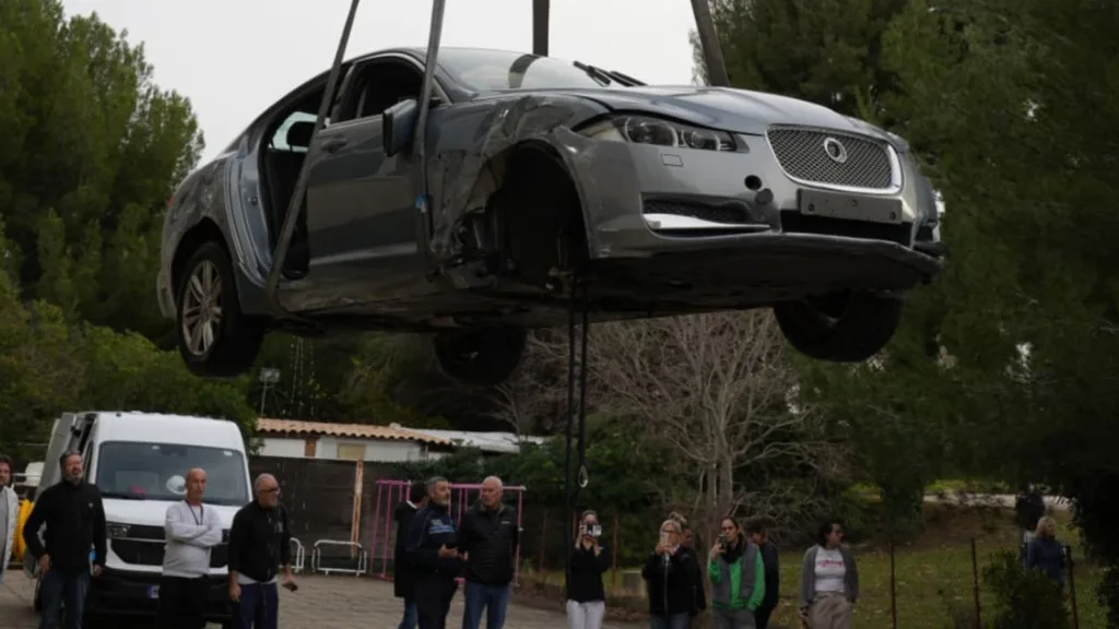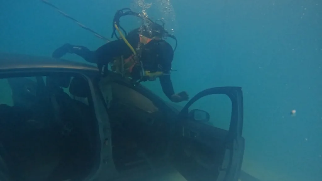 Direkt efter olyckan genomfördes flera insatser för att få upp Jaguaren från poolen.