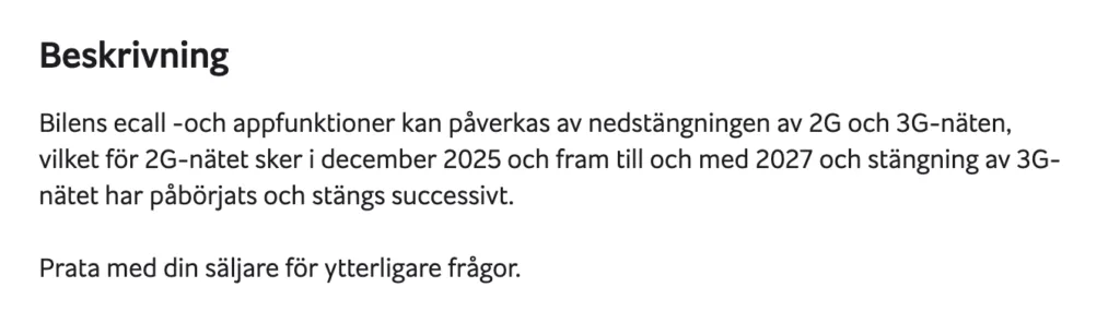 Trots att biltillverkarna känt till att näten ska släckas fortsätter de att sälja helt nya bilar med 2G-modem för den lagstadgade nödsamtalstjänsten eCall. Den ska larma SOS om du råkar ut för en olycka. Orsaken är att de är de gamla modemen lagliga enligt EU:s regler. Bilarna har blivit typgodkända med den gamla standarden.