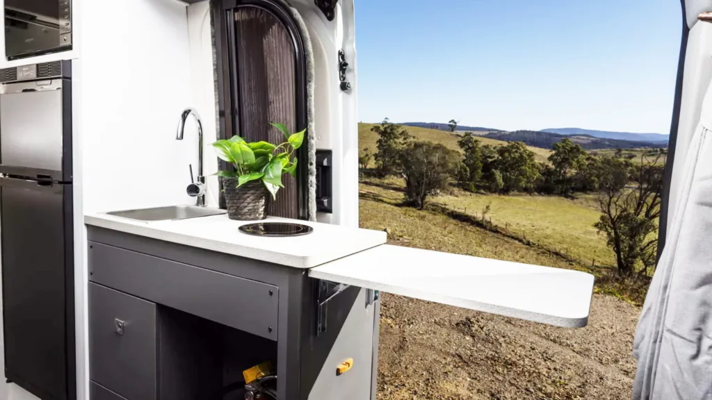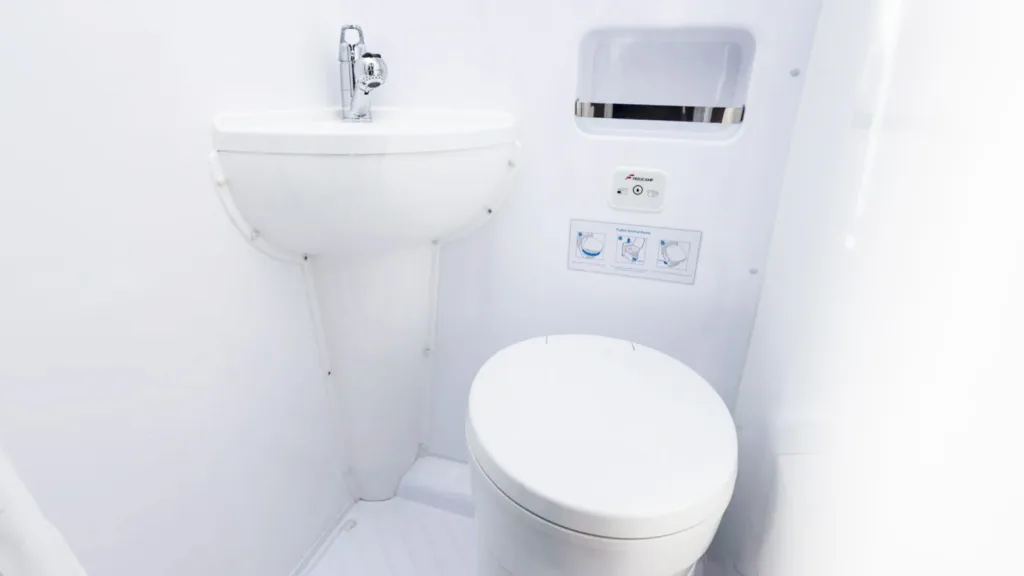 Här finns ett komplett kök med kyl, frys, diskho, mikro och induktionshäll. En dörr bredvid leder in till ett helgjutet badrum med dusch och för varma dagar finns även en utedusch. Fram i bilen möts man av två snurrstolar och ett hopfällbart bord. Bak finns en dubbelsäng som går att ta fram på en minut utan att blockera bakdörrarna. Det är enkelt, smart och rakt på sak. Två personer sover bekvämt men fler än så är svårt att få in utan kompromisser.