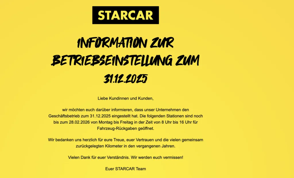 Innan kraschen hade de över 100 uthyrningsställen och var en av Tysklands största biluthyrare tillsammans med Sixt, Europcar och Hertz. Men de klarade sig inte i den tuffa konkurrensen. Nu bekräftar konkursförvaltaren Dr. Christoph Morgen att Starcar och dess dotterbolag kommer likvideras.