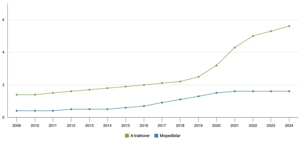 A-traktorer och mopedbilar är två av de snabbast växande fordonssegmenten i Sverige. I dag finns över 59 000 A-traktorer och 17 000 mopedbilar på svenska vägar. På 15 år har antalet A-traktorer stigit med 348 procent, och mopedbilarna har under samma period ökat med 368 procent. Trenden fortsätter att peka uppåt.