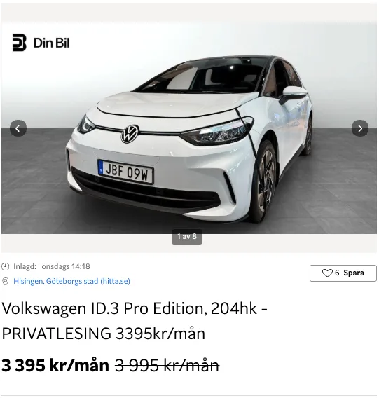 Elbilen Volkswagen ID.3 har blivit Sveriges mest privatleasade elbil i år. Nu slår en handlare till med en riktig rea på modellen. Kampanjen gäller fram till nyår och omfattar 36 månader med 1 000 mil per år, inklusive serviceavtal. Tidigare kostade den 3 995 kronor per månad att privatleasa. Nu har den sänkts med flera hundralappar per månad, som på tre år blir flera tusen kronor. Och jämför man det med att köpa bilen så blir det tydligt att det går att spara rejält.