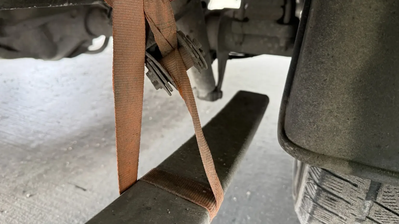 När kontrollanterna tittade under bilen trodde de knappt sina ögon. Den trasiga bladfjädern hölls ihop av ett vanligt orange spännband.