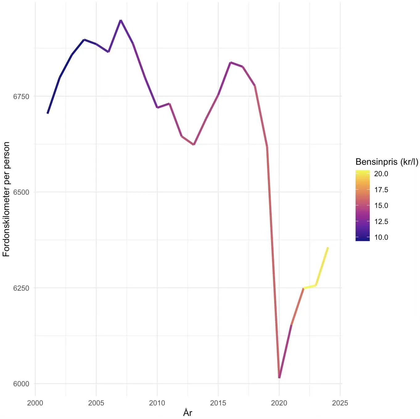 Det tydligaste undantaget är pandemiåret 2020, då resandet föll kraftigt av helt andra skäl: distansarbete, digitala möten och minskat vardagsresande. Efter pandemin har körsträckorna åter börjat stiga, samtidigt som bensinpriset nått historiskt höga nivåer. Men ännu är vi inte tillbaka på nivåerna före pandemin, och förändrade arbetsmönster med fler digitala möten och hybridarbete har sannolikt minskat behovet av resor permanent.