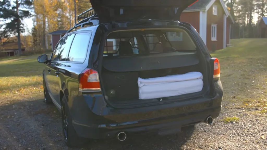 – Det här är nog en av de sista Volvobilarna där du faktiskt får plats att sova två meter i bagaget, säger han.