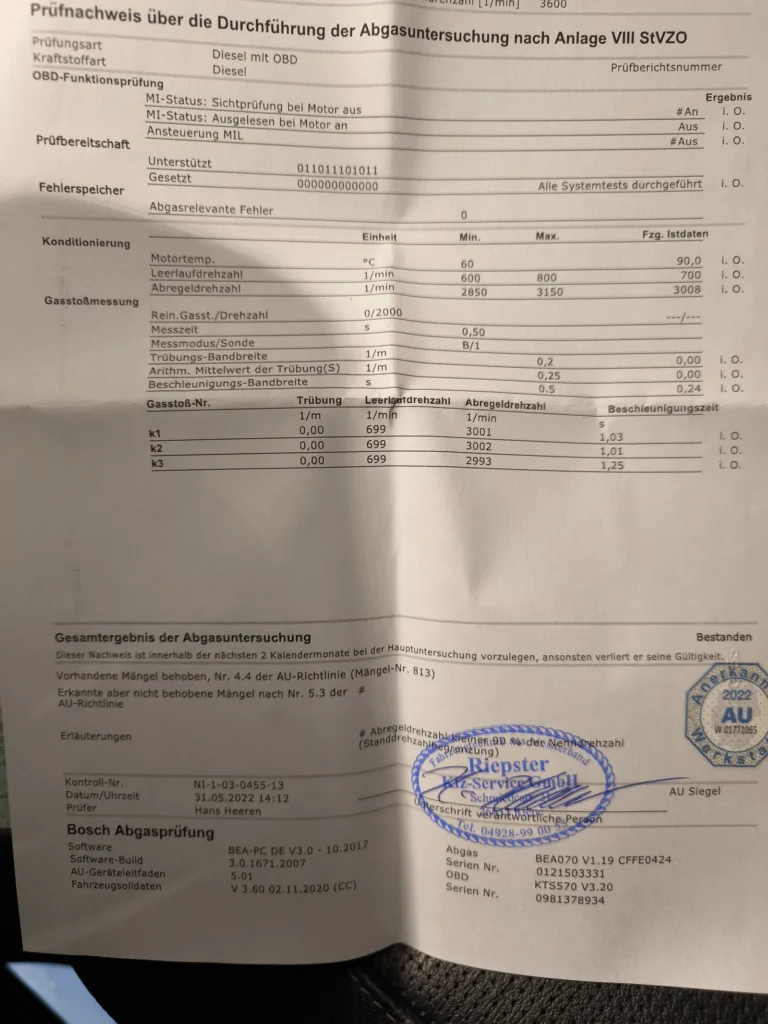 Han visar sina besiktningsprotkoll från Tyskland. Marios bil klarar utan problem de nya och hårdare EU-kraven för dieselbilar.