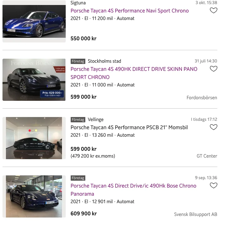 Idag hittar du en Taycan 4S från 2021 med 11 500 mil säljs på Blocket för 599 000 kronor, trots att nypriset – en värdeminskning på 670 000 kronor på cirka fyra år. En annan med 11 200 mil ligger ute för ännu billigare, 550 000 kronor, och det finns flera välutrustade modeller från samma år för under eller strax över 600 000 kronor.