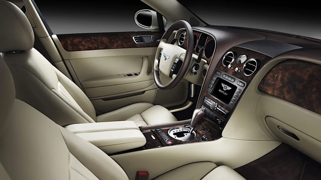 Exteriören på nya Flying Spur kunde knappast ha blivit mer spektakulär. De fyra runda strålkastarna gick rakt emot Bentleys klassiska designarv. Men i mitten stod däremot den handgjorda, kromade grillen – ett konstverk i sig som var typiskt för Bentley. Precis som med alla Bentley-modeller byggdes bilen efter varje kunds exakta önskemål, med ett urval av sjutton karossfärger, bland annat den populära “Beluga”, som fortfarande används än idag. Just nu finns ett exemplar till salu i Sverige, med just den färgen.