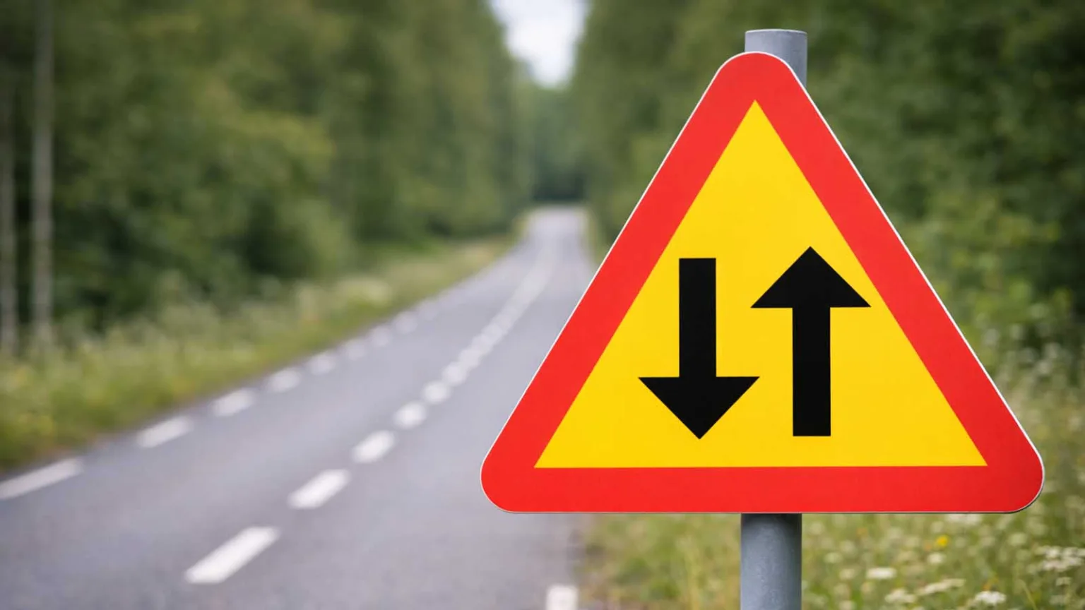 Eftersom det är en varningsskylt är den triangelformad. Sedan har Sverige som regel att varningsmärken ska ha en röd ram med en gul bakgrund. Den här skylten finns i flera EU-länder och används på samma sätt. Det handlar om ett vägavsnitt där trafiken möts efter att det har varit enkelriktat eller avskilt på något sätt. Svenska varningsskyltar skiljer sig från övriga Europa genom att vi har en gul botten. Medan de flesta andra länder har en vit. LÄS MER: