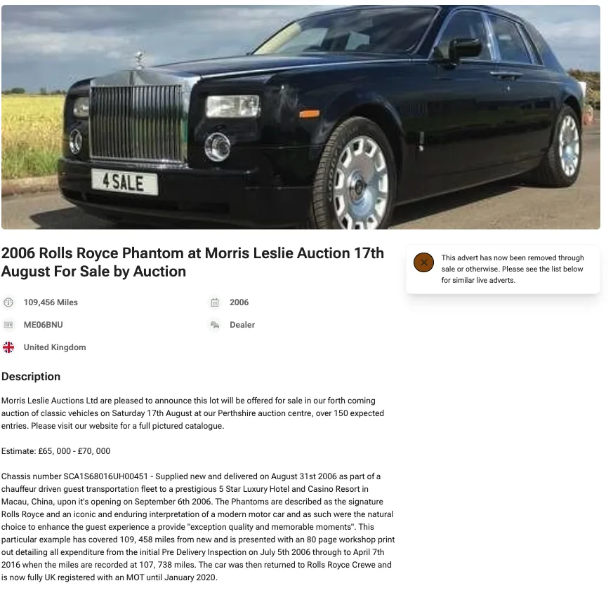 Enligt uppgifter från en tidigare auktion i Storbritannien, kopplad till samma chassinummer, ska bilen ha levererats ny till ett lyxhotell i Macau i Kina. Där användes den som chaufförsbil och hade redan då rullat över 109 000 miles, motsvarande drygt 17 000 mil. Det står i stark kontrast till dagens mätarställning på under 8 000 mil. Det går inte att fastställa exakt vad som hänt däremellan, men uppgifterna väcker frågor kring bilens historik och mätarställning.