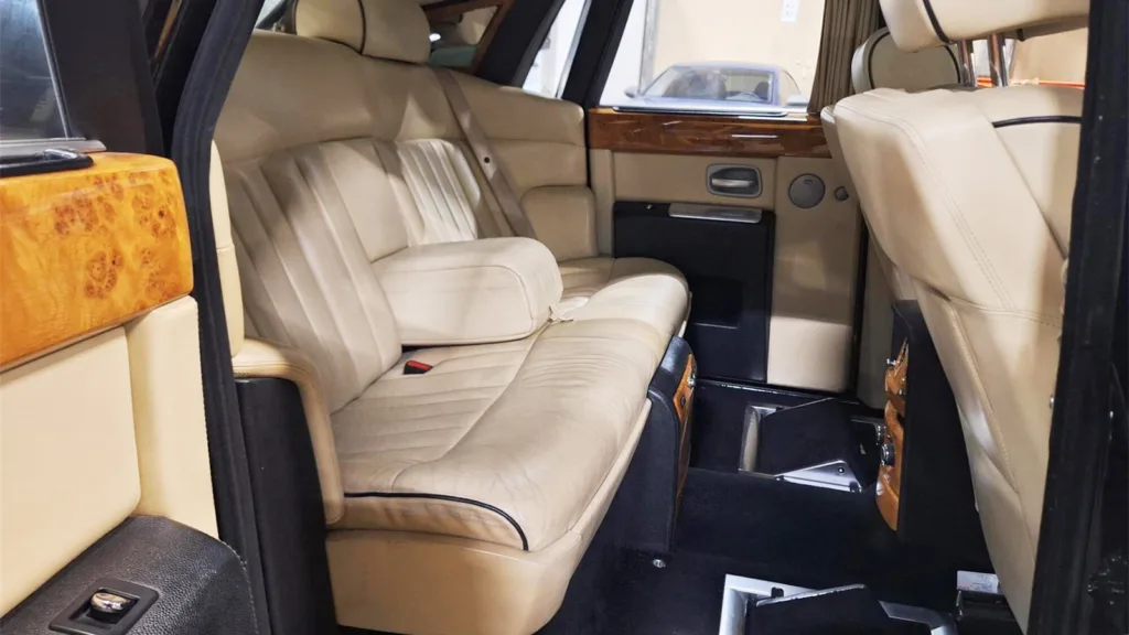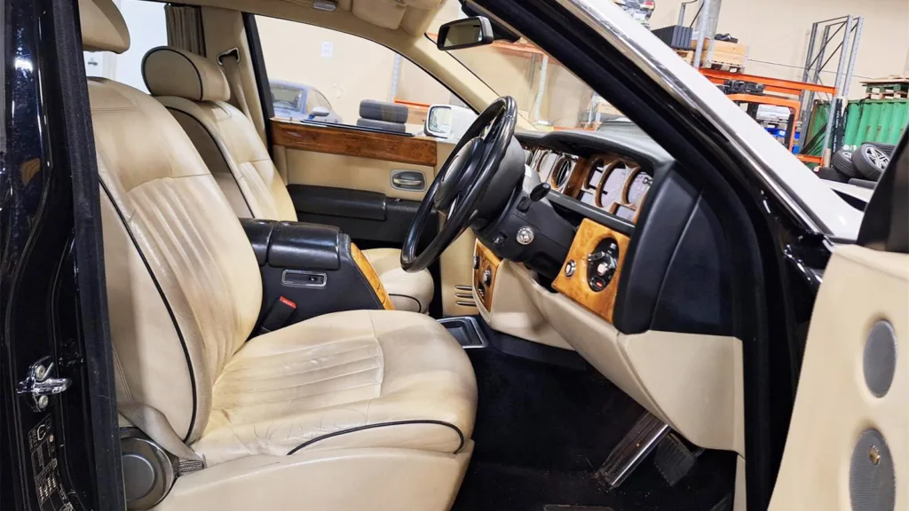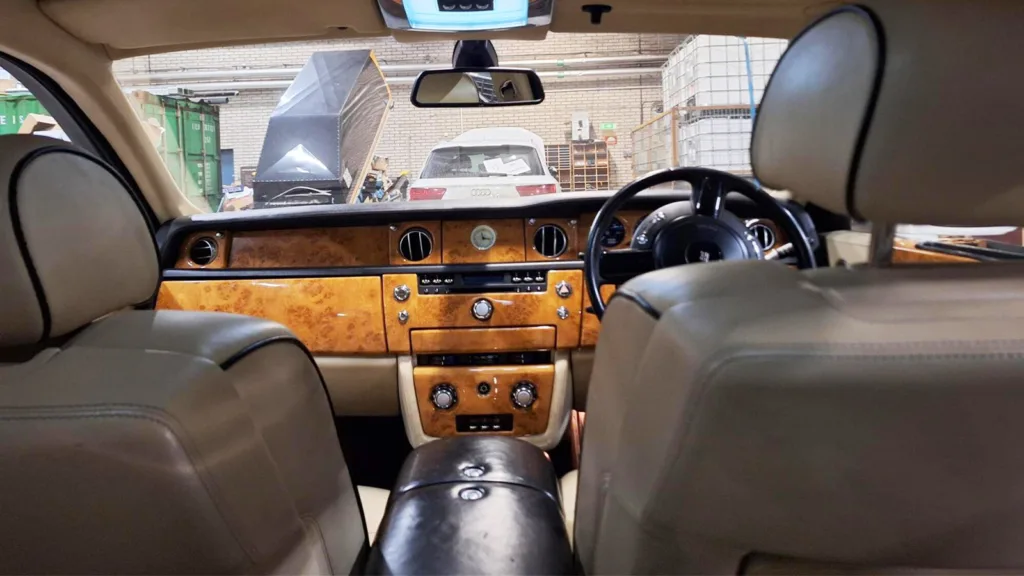 Bilen är högerstyrd och importerades till Sverige 2022, men är i grunden från 2006. Trots åldern visar mätaren strax under 8 000 mil. Men allt är inte som det ser ut. Invändigt finns klassiska Rolls-Royce-detaljer som beige skinn, omfattande träpaneler och märkets ikoniska paraplyer i dörrarna. Men bilden av det brittiska prestigeåket är inte lika exklusiv när man tittar närmare.